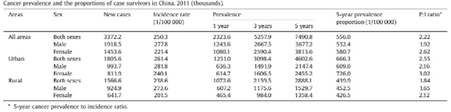 调查显示,截至2011年,我国5年内被诊断为癌症病例数约为749万,其中男性患者368万人,女性患者381万人,总体5年癌症患病率为556/10万。并且存在地区性差异,农村地区癌症患病率为440/10万人,而城市地区患病率却为666/10万人,远高于农村地区。