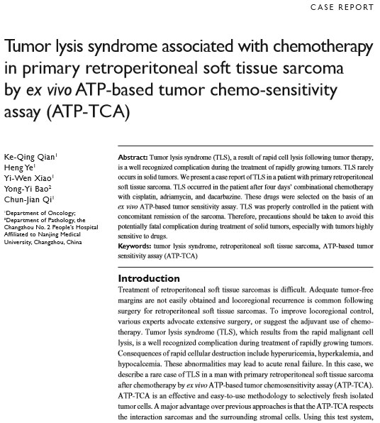 Tumor lysis syndrome associated with chemotherapy in primary retroperitoneal soft tissue sarcoma by ex vivo ATP-based tumor chemo-sensitivity assay (ATP-TCA)