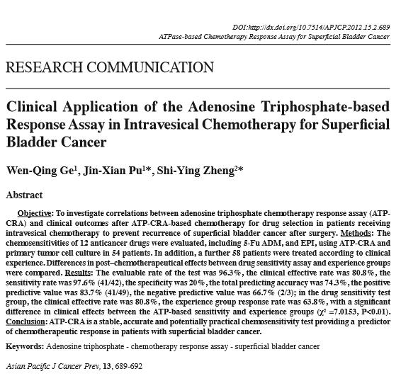 Abstract Objective: To investigate correlations between adenosine triphosphate chemotherapy response assay (ATPCRA) and clinical outcomes after ATP-CRA-based chemotherapy for drug selection in patients receiving intravesical chemotherapy to prevent recurrence of superficial bladder cancer after surgery. Methods: The chemosensitivities of 12 anticancer drugs were evaluated, including 5-Fu ADM, and EPI, using ATP-CRA and primary tumor cell culture in 54 patients. In addition, a further 58 patients were treated according to clinical experience. Differences in post–chemotherapeutical effects between drug sensitivity assay and experience groups were compared. Results: The evaluable rate of the test was 96.3%, the clinical effective rate was 80.8%, the sensitivity rate was 97.6% (41/42), the specificity was 20%, the total predicting accuracy was 74.3%, the positive predictive value was 83.7% (41/49), the negative predictive value was 66.7% (2/3); in the drug sensitivity test group, the clinical effective rate was 80.8%, the experience group response rate was 63.8%, with a significant difference in clinical effects between the ATP-based sensitivity and experience groups (χ2 =7.0153, P<0.01). Conclusion: ATP-CRA is a stable, accurate and potentially practical chemosensitivity test providing a predictor of chemotherapeutic response in patients with superficial bladder cancer.
